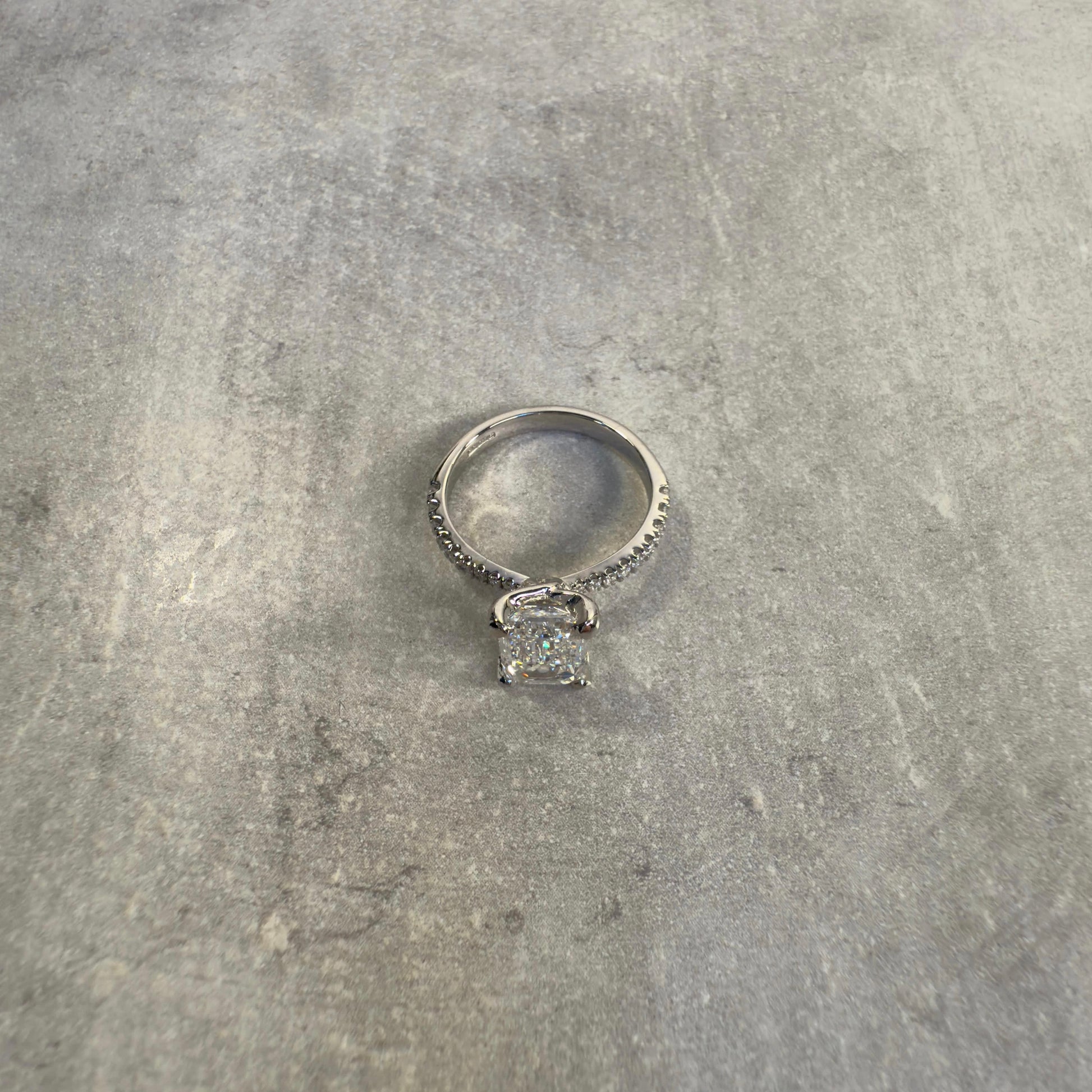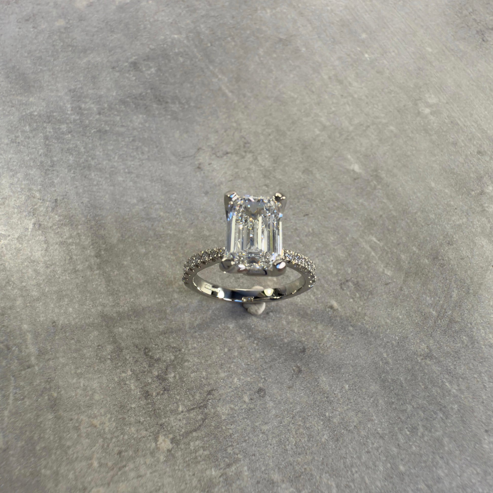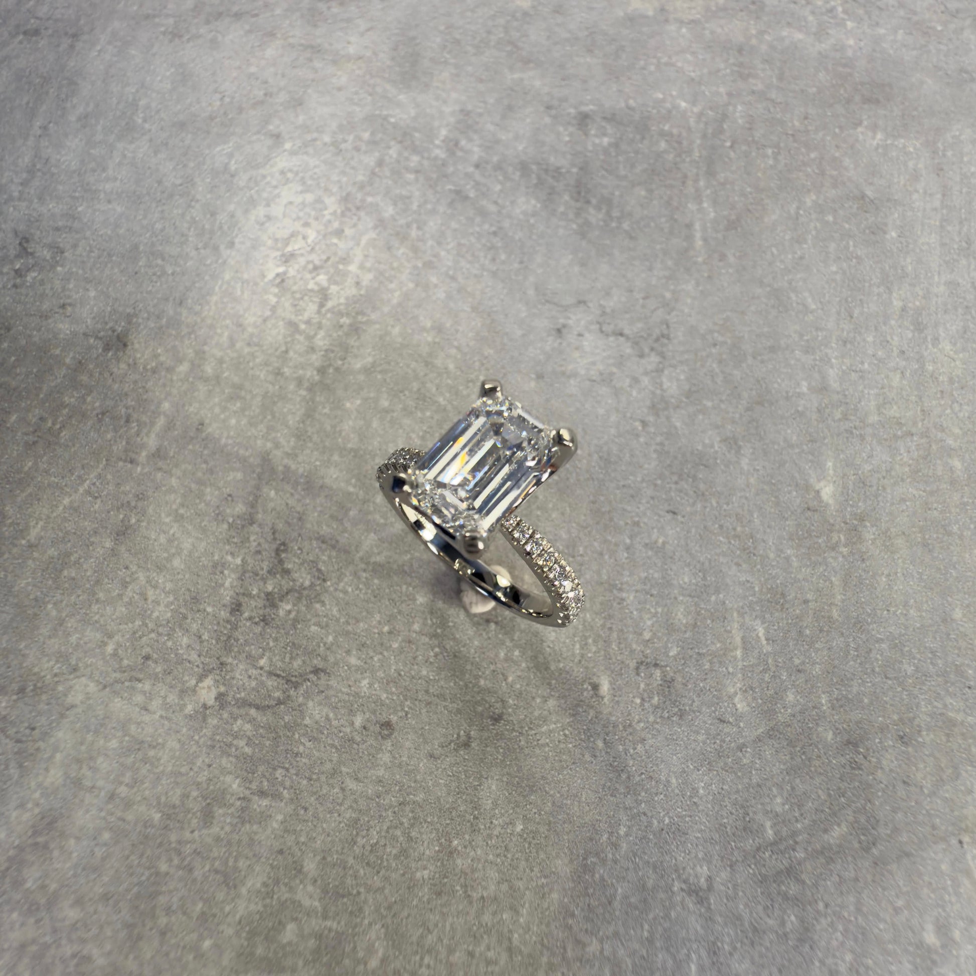 Designed to captivate from every angle. Featuring a striking Emerald-cut centre stone, this piece is enhanced by diamond-set shoulders which are tapered that provide 50% coverage, delivering radiant sparkle and refined luxury.